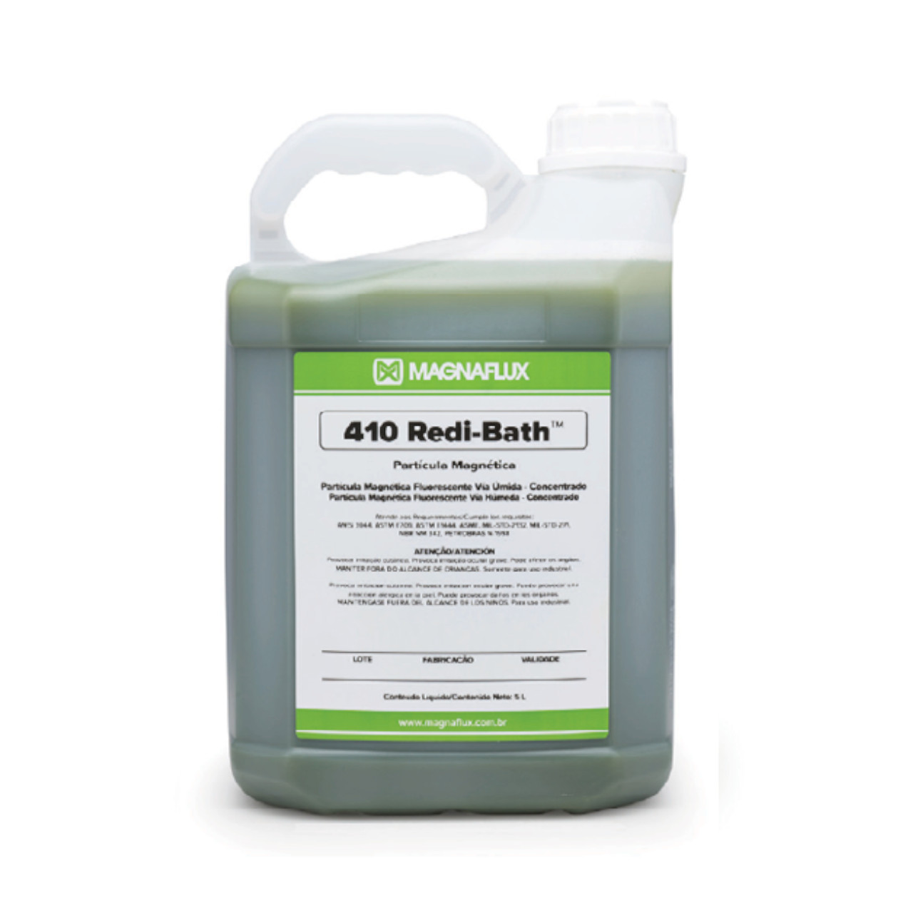 O 410 Redi-Bath é uma suspensão das partículas magnéticas fluorescentes MG-410 em base água, altamente sensível, utilizado para a localização de micro descontinuidades, principalmente em superfícies brutas.
