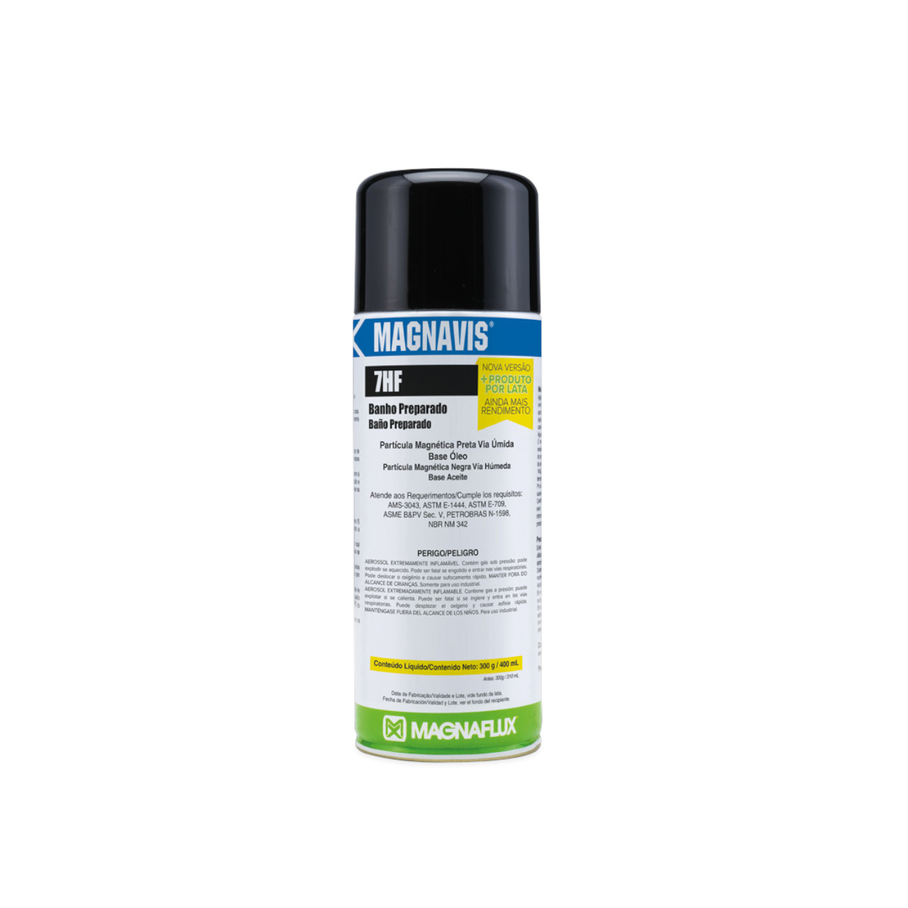 7HF é um aerossol de suspensão de partículas magnéticas visíveis de cor preta com base em óleo altamente sensível, para o método úmido não fluorescente do ensaio de partículas magnéticas.