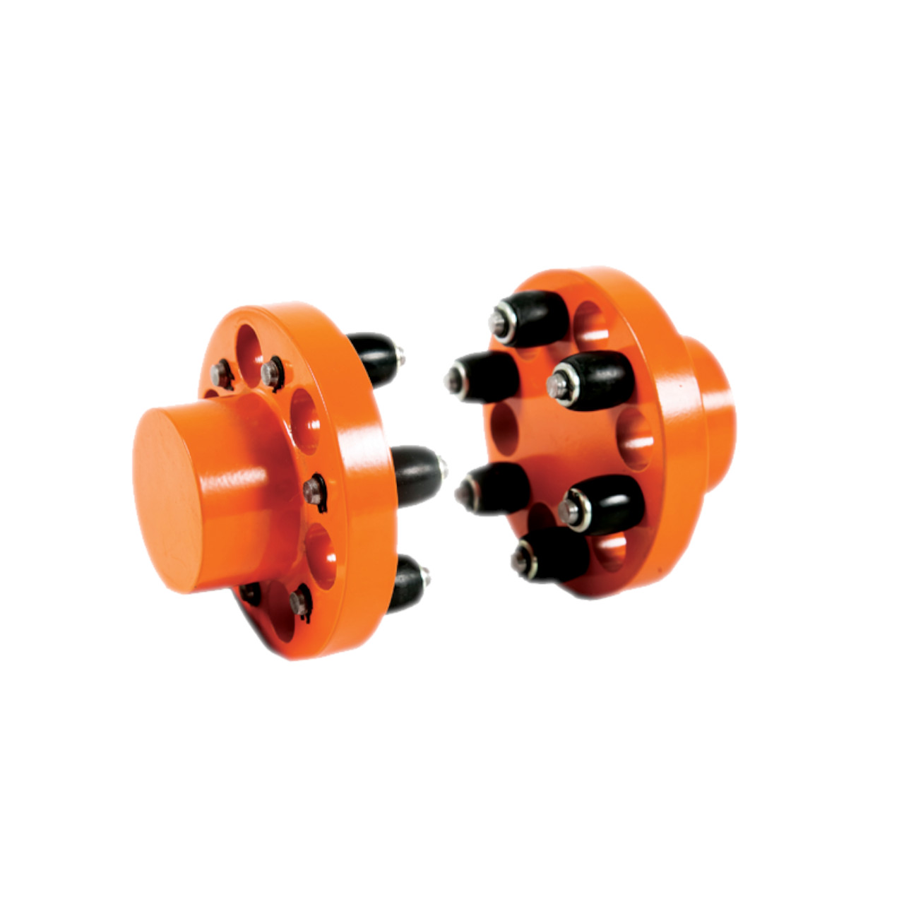 Acoplamento composto por dois flanges usinados de forma simétrica, pinos de aço com superfícies retificadas e buchas de borracha nitrílica à prova de óleo, que são fixadas por anéis elásticos.